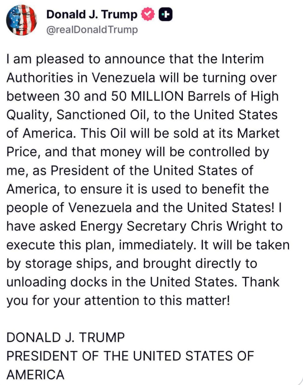 “This oil will be sold at its market price, and that money will be controlled by me, as President of the United States of America, to ensure it is used to benefit the people of Venezuela and the United States.