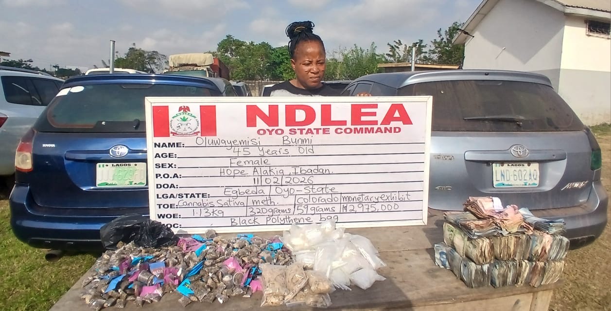 A notorious female drug dealer in Ibadan, Oyo State, Oluwayemisi Bunmi, 45, was on Wednesday, February 11, arrested at her enclave in Hope Alakia area of the state capital. Recovered from her include: 1.189kg Colos, skunk; 320grams of methamphetamine; monetary exhibit of ₦2,975,000 and two cars: a Navy blue Toyota Matrix car marked JJJ 629 FQ and a Sky blue Toyota Matrix car with registration number LND 602 AQ.
