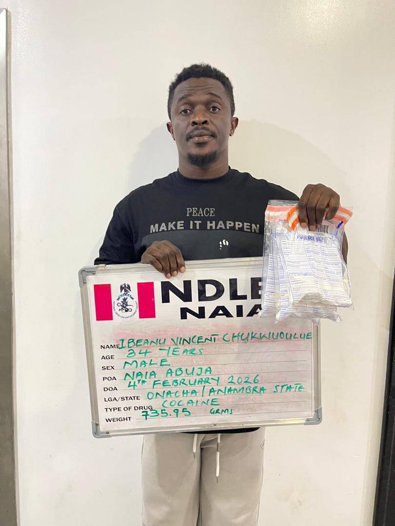 The 34-year-old Ibeanu was arrested on Wednesday, February 4, 2026, while on board a Qatar Airways flight 1432 from Kano to China enroute Abuja/Doha. Acting on credible intelligence, NDLEA operatives at the Abuja airport demanded that the suspect be deboarded following which he was taken for body scan. The result confirmed the suspect ingested illicit drug.